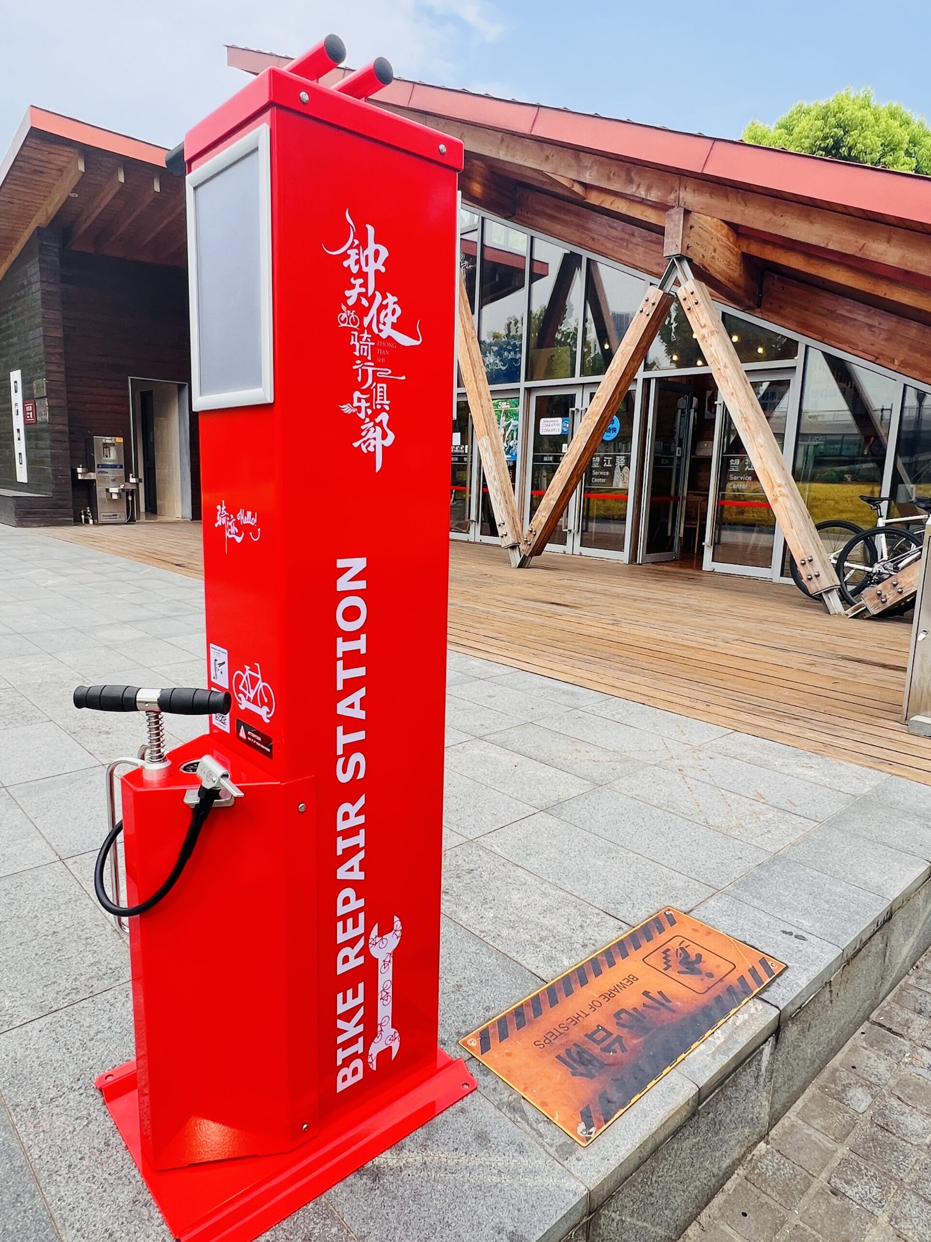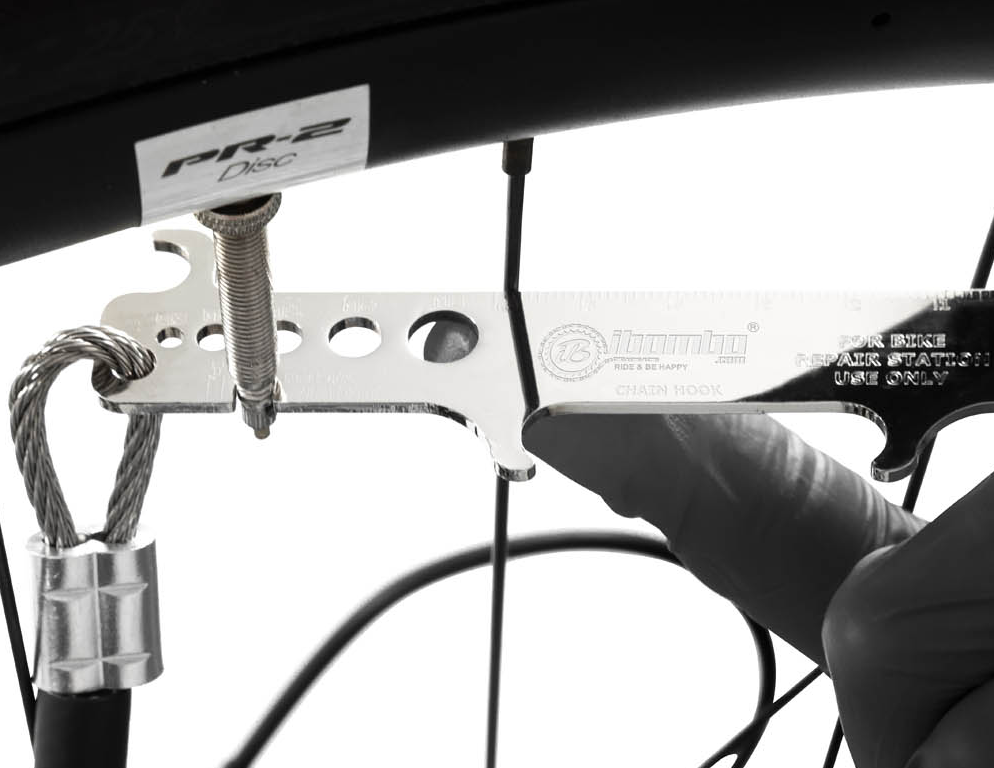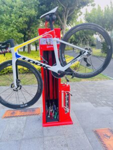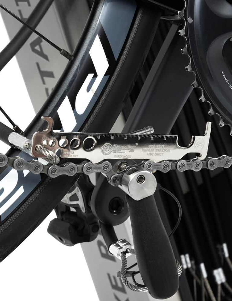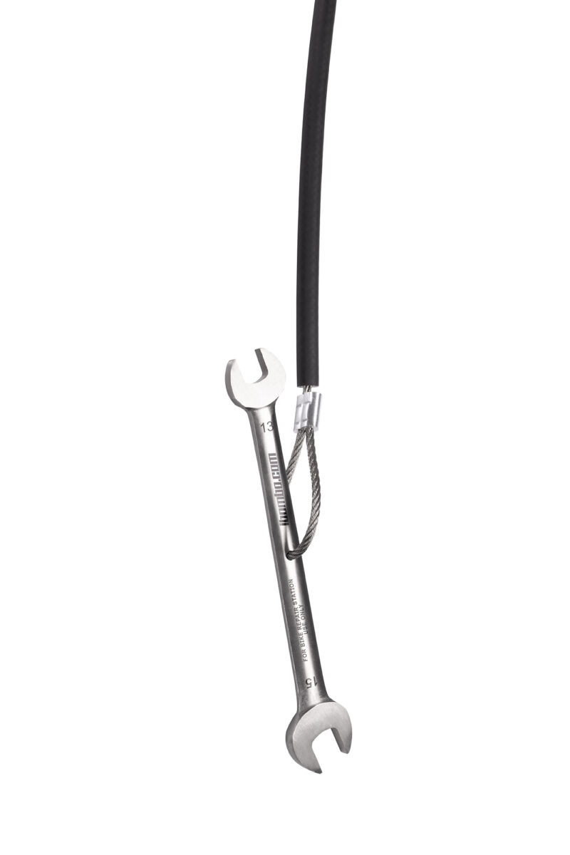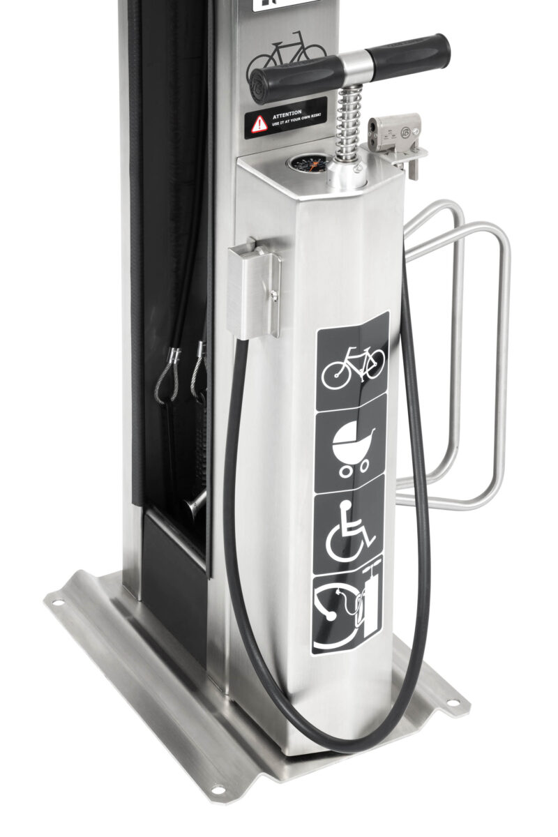 工具通过不锈钢绳索悬挂在站点的柱体内部;绳索的长度足以触及所有自行车部件。绳索表面的橡胶涂层可防止工具缠绕,并保护自行车车架免受刮伤。站点的结构允许用户将自行车放置在支架上,这样在维修时可以轻松转动曲柄。该站点还配备了带适配器的手动泵,适用于所有类型的气门嘴。