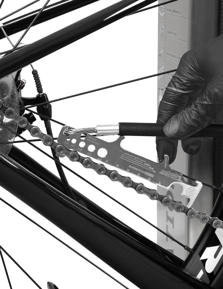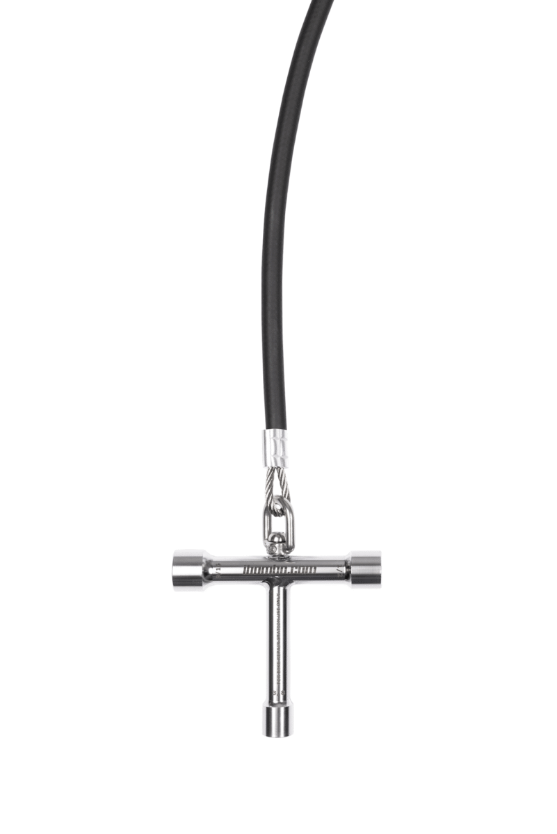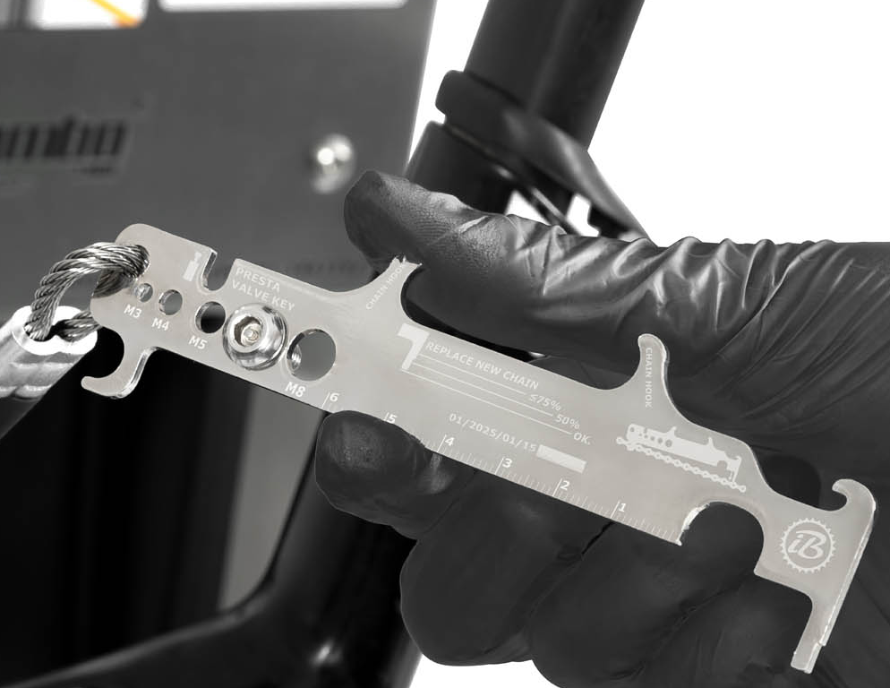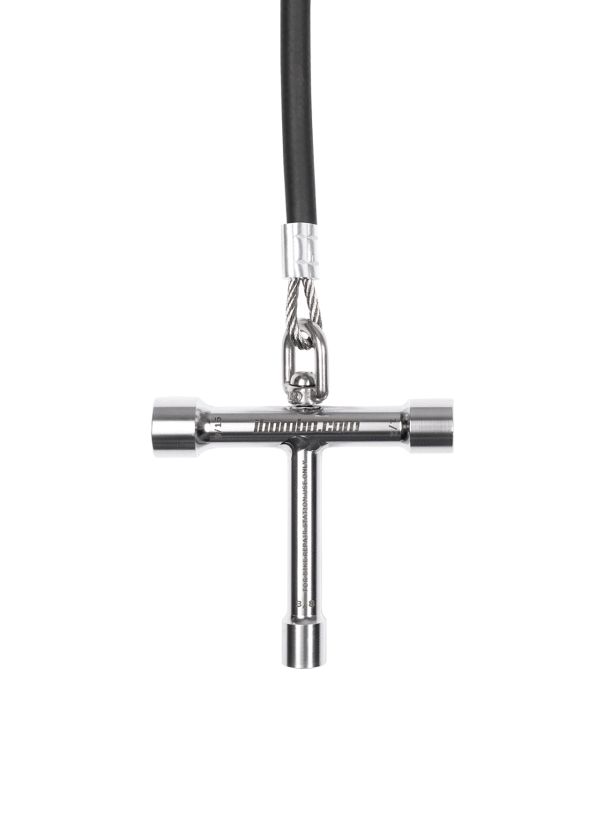 工具通过不锈钢绳索悬挂在站点的柱体内部;绳索的长度足以触及所有自行车部件。绳索表面的橡胶涂层可防止工具缠绕,并保护自行车车架免受刮伤。站点的结构允许用户将自行车放置在支架上,这样在维修时可以轻松转动曲柄。该站点还配备了带适配器的手动泵,适用于所有类型的气门嘴。