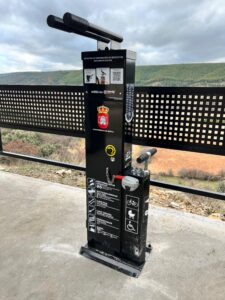该站点配备了带适配器的手动泵,适用于所有类型的气门嘴。站点的结构设计允许用户将自行车放置在支架上,这样在维修时可以轻松转动曲柄。